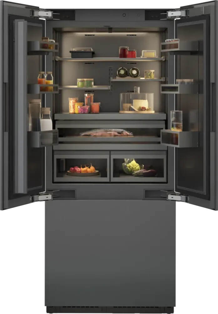 Габариты прибора рассчитаны на просторную нишу, а общий объем 576 литров, из которых 379 литров отведено под холодильную секцию и 197 литров под морозильную, делают хранение гибким и удобным для большой семьи. Внутренняя планировка продумана до мелочей: четыре стеклянные полки в рамке с возможностью регулировки по высоте и шесть полок на дверце позволяют с комфортом размещать высокие бутылки и широкие контейнеры. Интерьер выполнен в темной матовой нержавеющей стали с алюминиевыми элементами, что облегчает очистку и придает технике премиальный вид, а светодиодная подсветка равномерно освещает камеры, экономно расходуя энергию. В зоне свежести предусмотрены две отдельные емкости с независимой регулировкой температуры и влажности, которые сохраняют овощи, мясо и рыбу в оптимальных условиях, уменьшая потерю влаги и продлевая срок хранения.