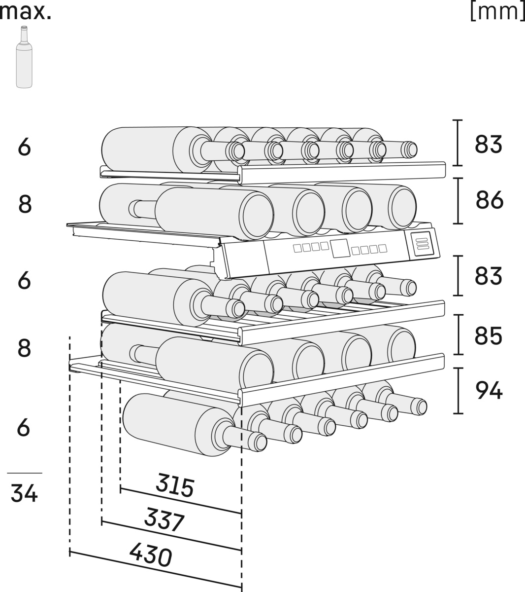 Температура хранения вина устанавливается на панели управления, а цифровой индикатор покажет действительную температуру с точностью до градуса. Звуковая и визуальная сигнализация информирует об открытой двери и/или изменении температуры внутри винного шкафа. Панель управления оснащена функцией блокировки, чтобы избежать изменения параметров настройки детьми.