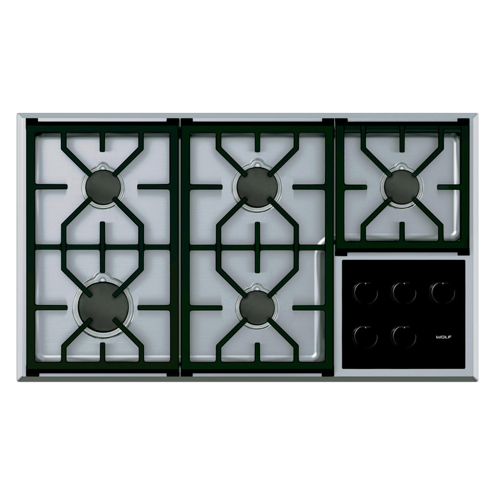 На варочной панели Transitional шириной 914 мм расположены 5 двухуровневых герметичных конфорок с запатентованным двухъярусным дизайном. Они обеспечивают особо скрупулезное управление процессом: от ультраделикатного пламени, идеального для плавления, приготовления соусов и супов, до жгучего, как в печи, пламени с увеличенной газовой мощностью в 5,3 кВт, благодаря чему закипание происходит на 25% быстрее, чем в предыдущих моделях. Прочные чугунные решетки с фарфоровым покрытием легко моются. Уникальный дизайн решёток позволяет перемещать посуду от конфорки к конфорке, не поднимая ее.