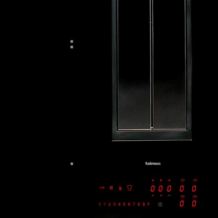 Встраиваемая модель с вытяжкой. Черная стальная рама с защитой от царапин. Варочные поля с функцией Bridge. Поверхность из закаленного стекла Schott. Установка сверху или заподлицо со столешницей.