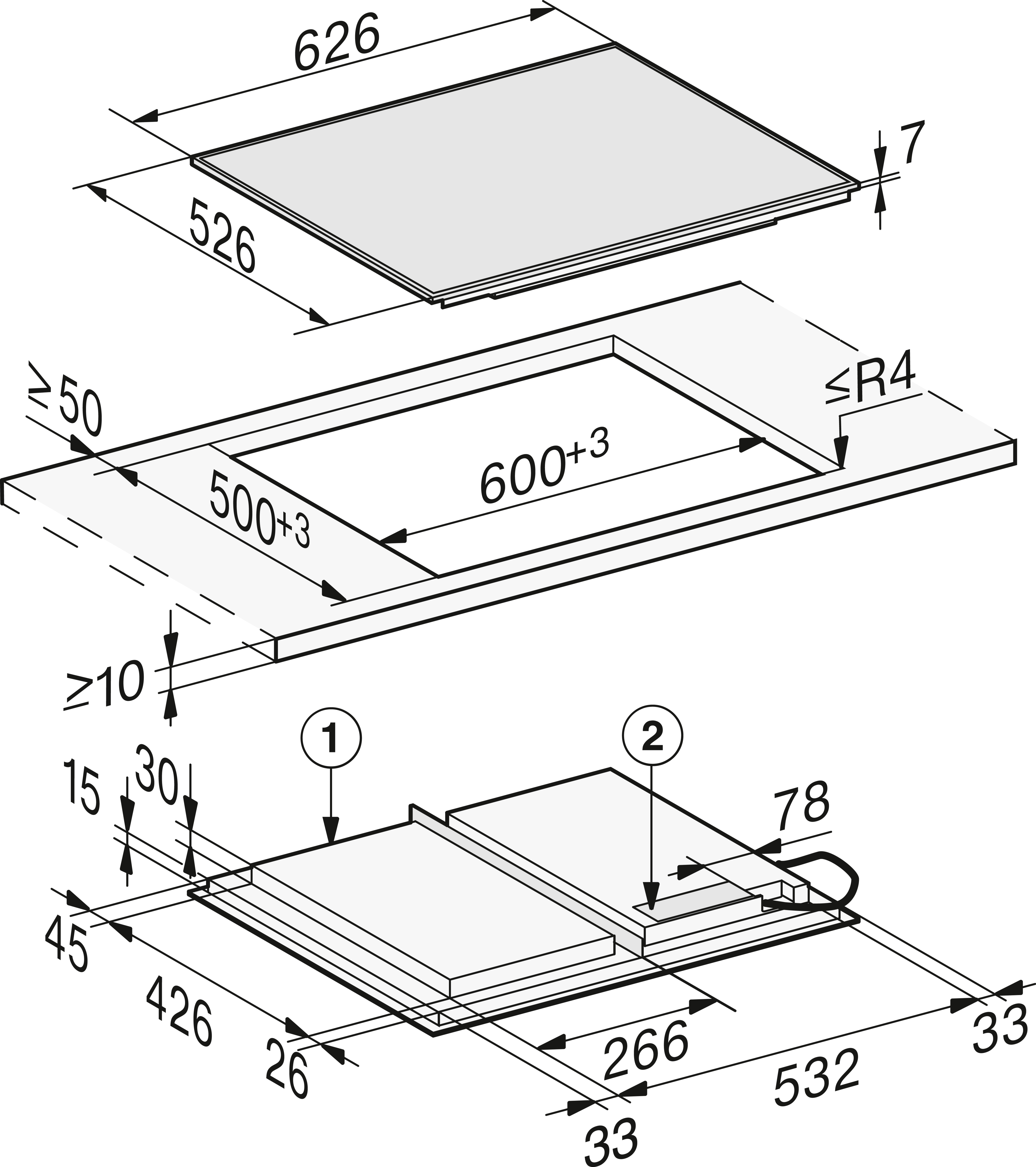 Размер ниши(Ш x Г): 600 х 500 (при монтаже сверху)или 600/624 x 500/524 (вырез ступенькой для монтажа заподлицо) мм