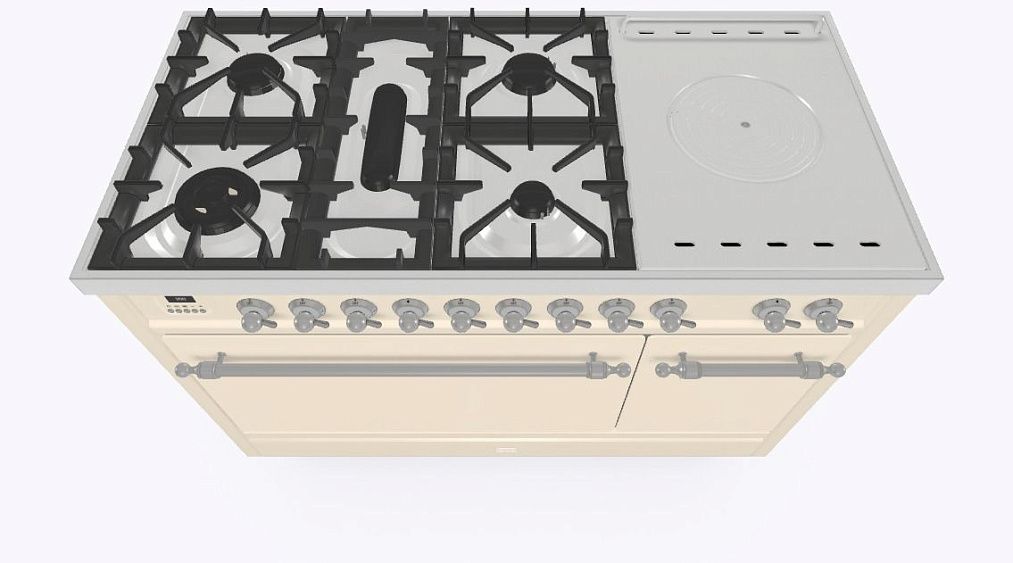 - Тип конфорок: 5 газовых, чугунная тарелка «Coupe de Feu» с кольцами
