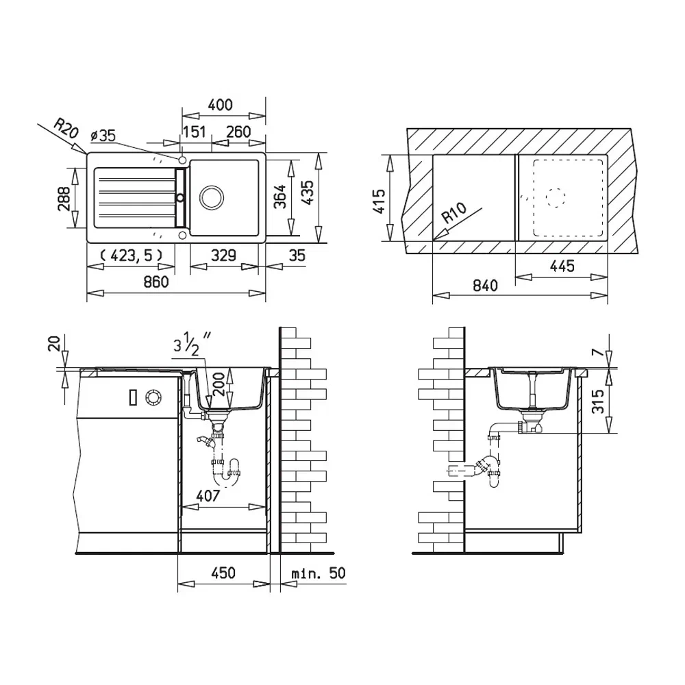• Диаметр слива 3 1/2”, перелив
