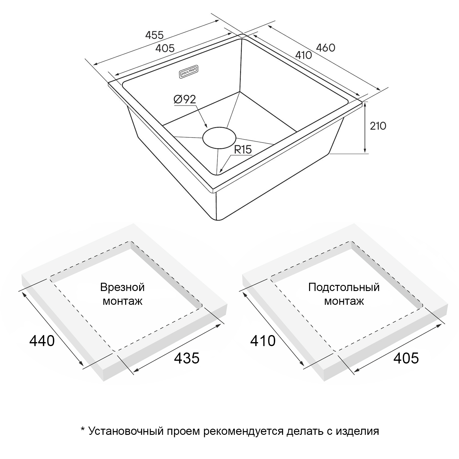 Мойка создана как для современного способа монтажа под столешницу, так и для классического врезного монтажа.