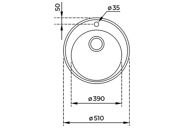 • Внешние размеры: ø510 мм, размеры чаши: ø390 х 160 мм