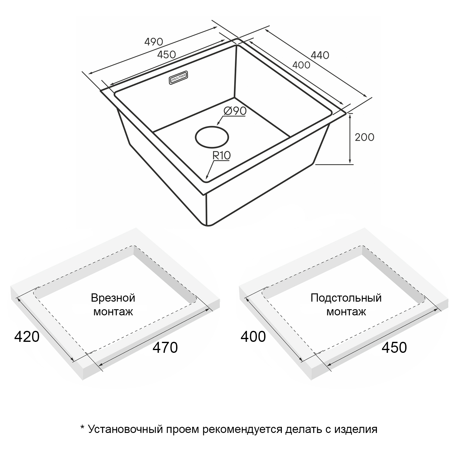 Мойки LASSAN UNI могут быть установлены как врезным способом поверх столешницы, так и под столешницу (подстольный монтаж).