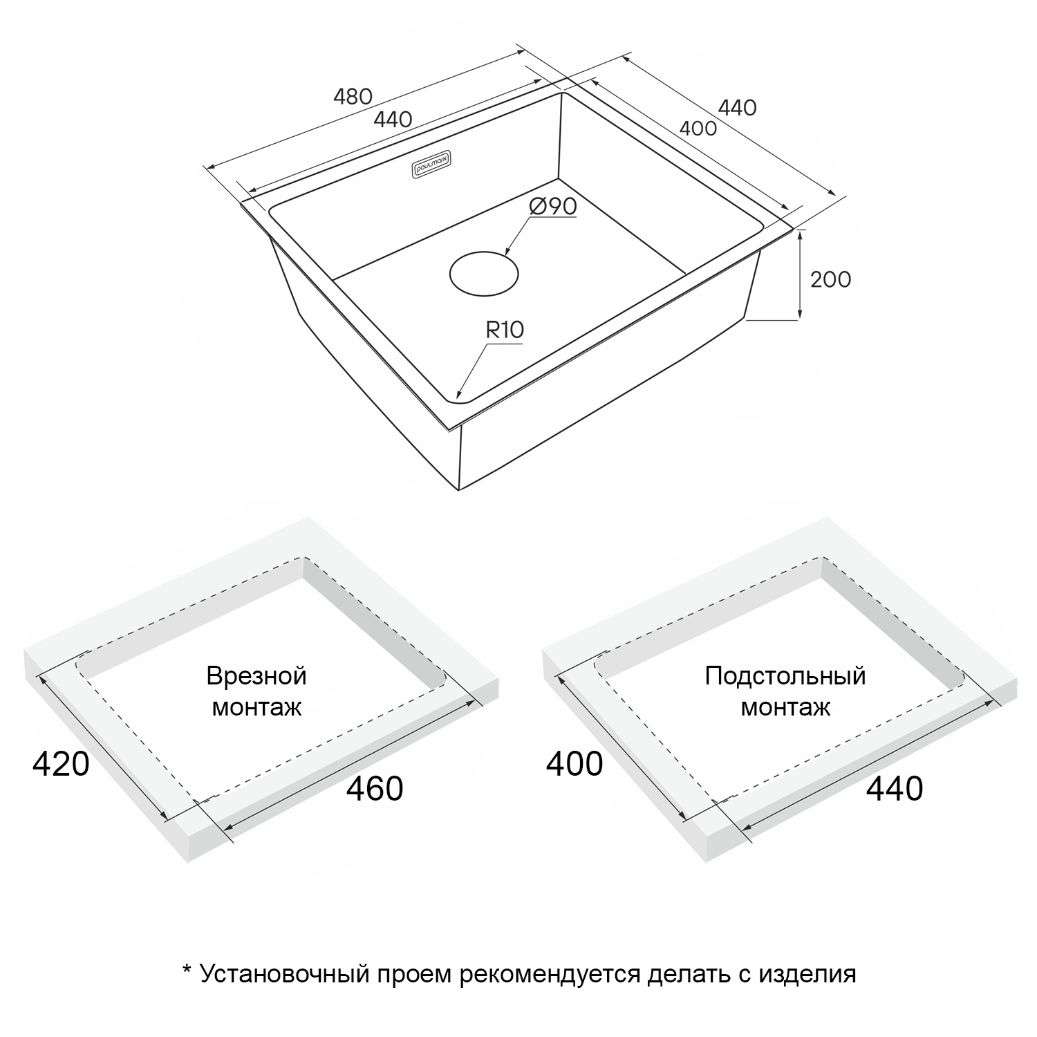 - Комплект крепежей для врезного монтажа; - Комплект для подстольного монтажа; - Отводная арматура (слив-перелив); - Сифон бутылочного типа с подключением посудомоечной машины (ПММ).