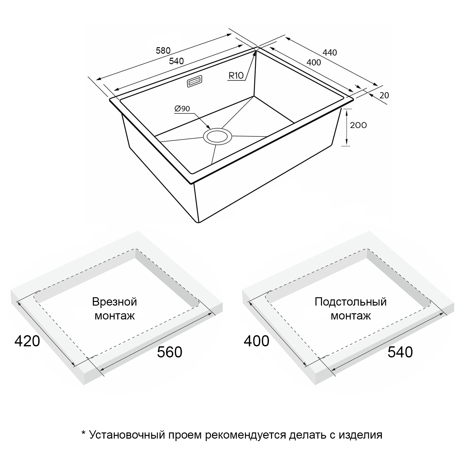 - Комплект крепежей для врезного монтажа; - Комплект для подстольного монтажа; - Отводная арматура (слив-перелив); - Сифон бутылочного типа с подключением посудомоечной машины (ПММ).