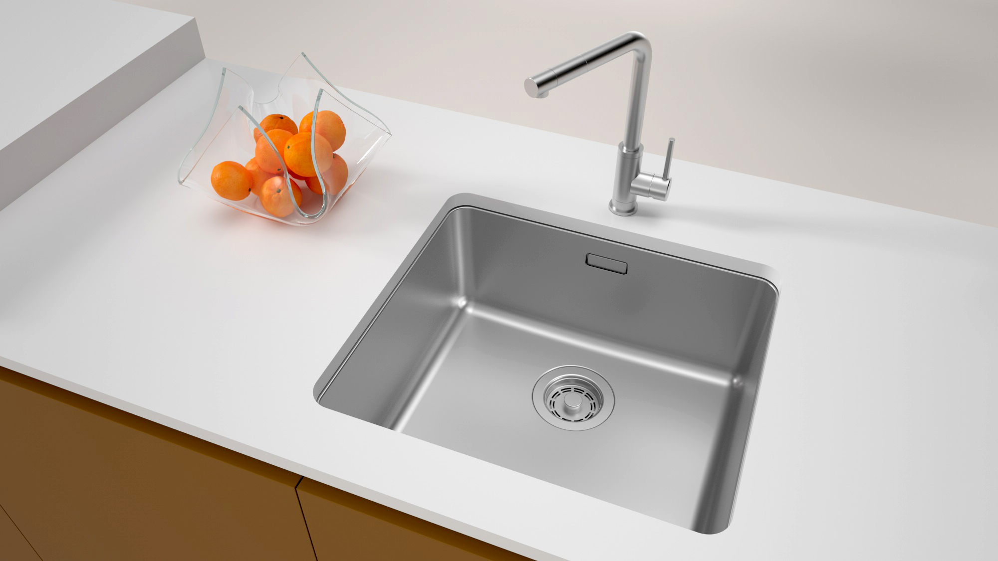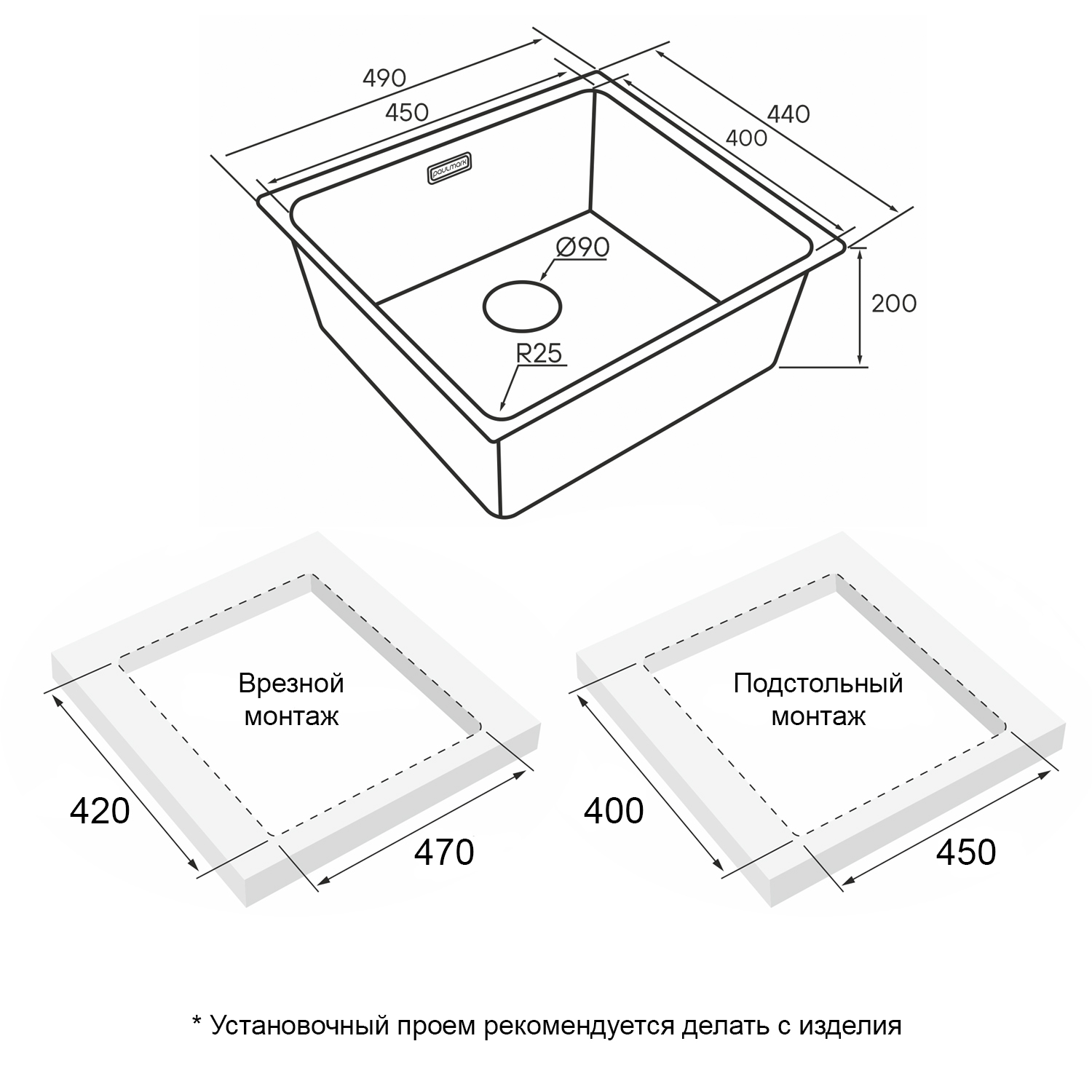 Мойки YUNI UNI могут быть установлены как врезным способом поверх столешницы, так и под столешницу (подстольный монтаж).