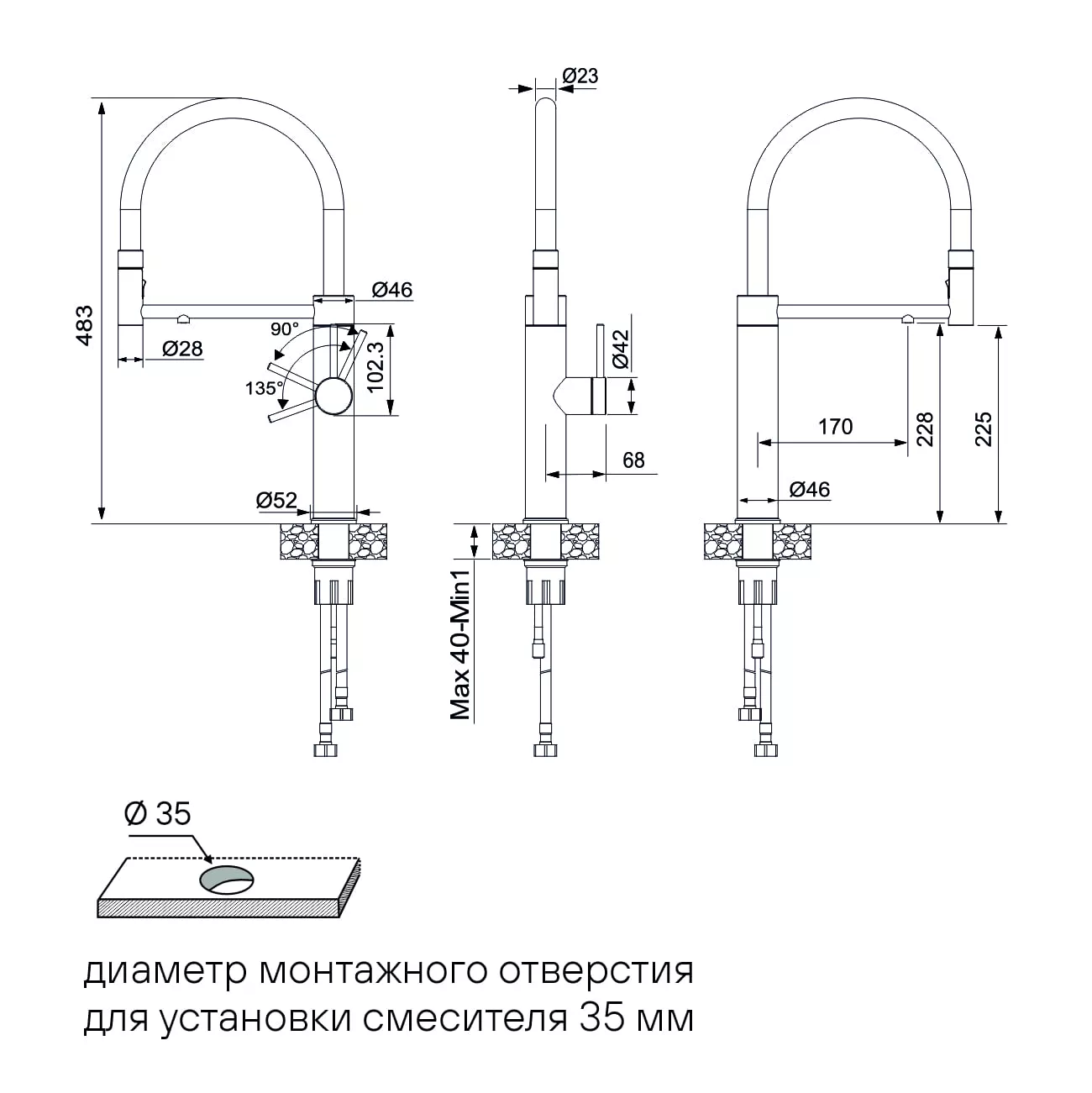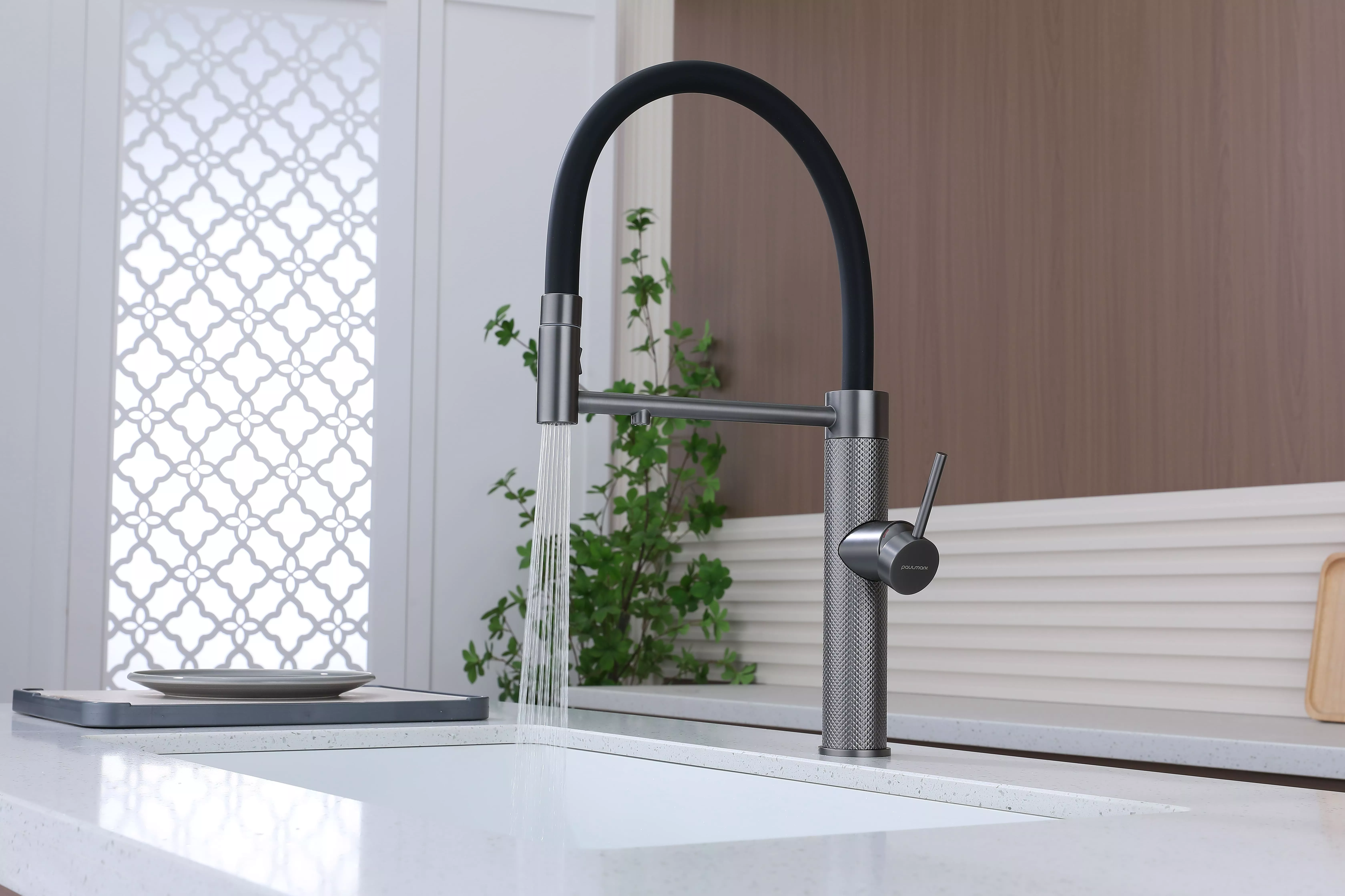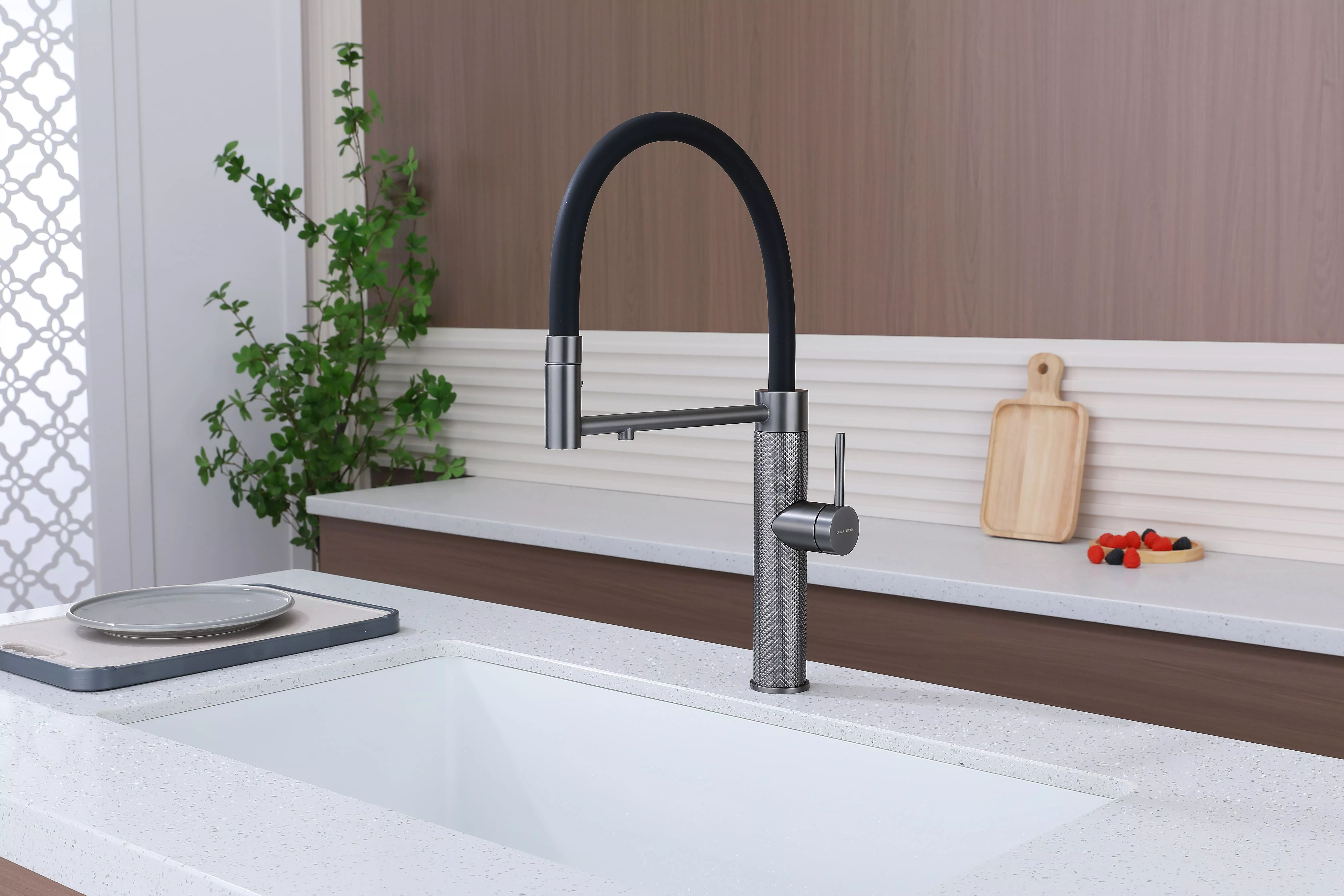 Смеситель для кухни GANYMEDE DIAMOND сочетает в себе стильный дизайн и передовые технологии. Благодаря функции подключения фильтра питьевой воды и специальной технологии Trinkwasser® водопроводная и очищенная вода никогда не смешиваются, а управление ими осуществляется единым удобным рычагом 2в1. Гибкий силиконовый излив обеспечивает широкий диапазон движений и надежно фиксируется элементом корпуса в форме кольца. На конце излива расположена кнопка для переключения между режимами струи и душа, что идеально подходит для мытья посуды и продуктов. Декоративные насечки на корпусе создают игру света и делают модель эксклюзивной. Излив поворачивается на 360°, а расширенная гарантия производителя составляет 8 лет.