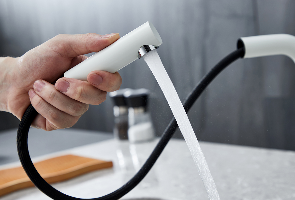 Конструкция смесителя с вытяжным шлангом значительно облегчает процесс мойки посуды или продуктов любого размера и формы.