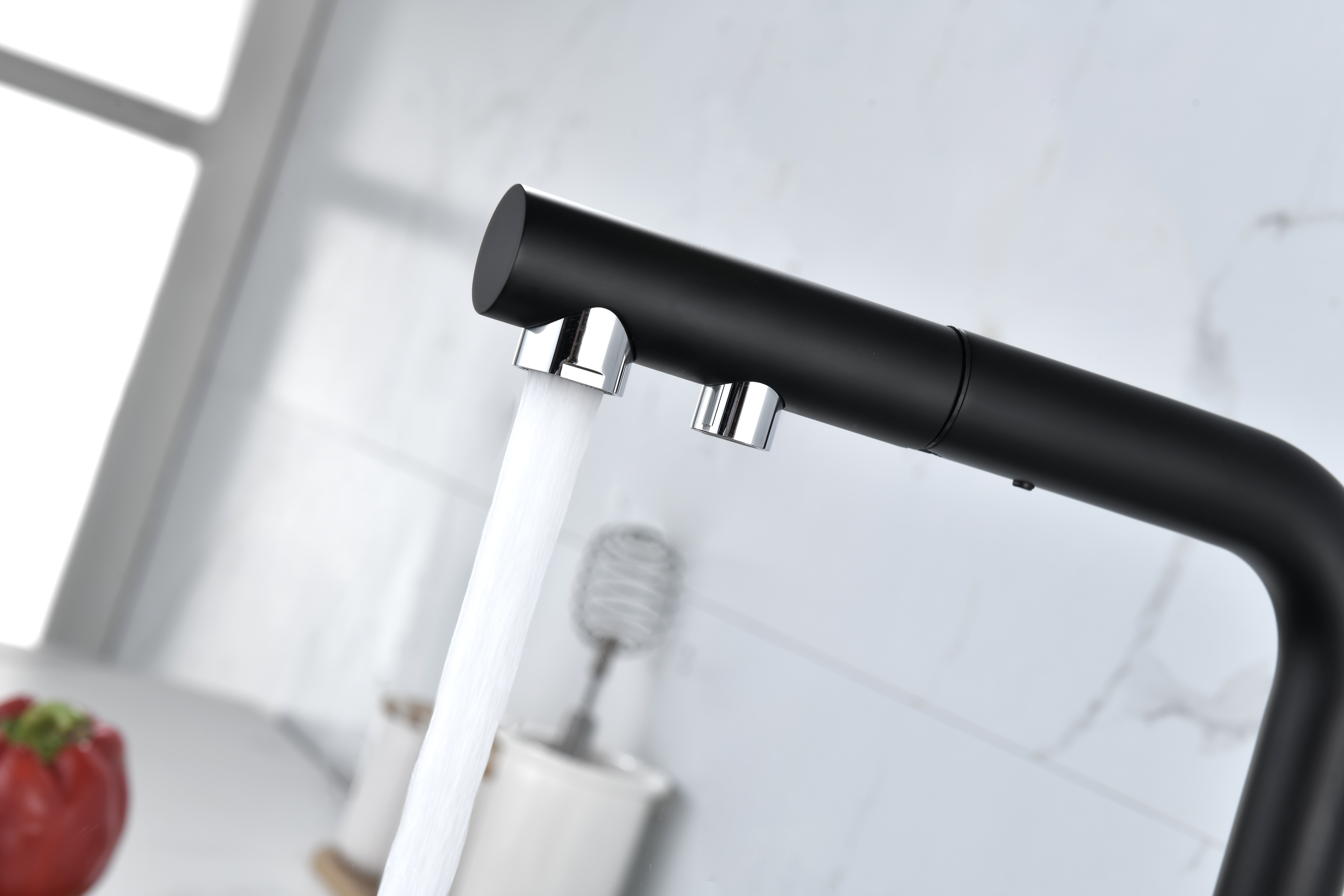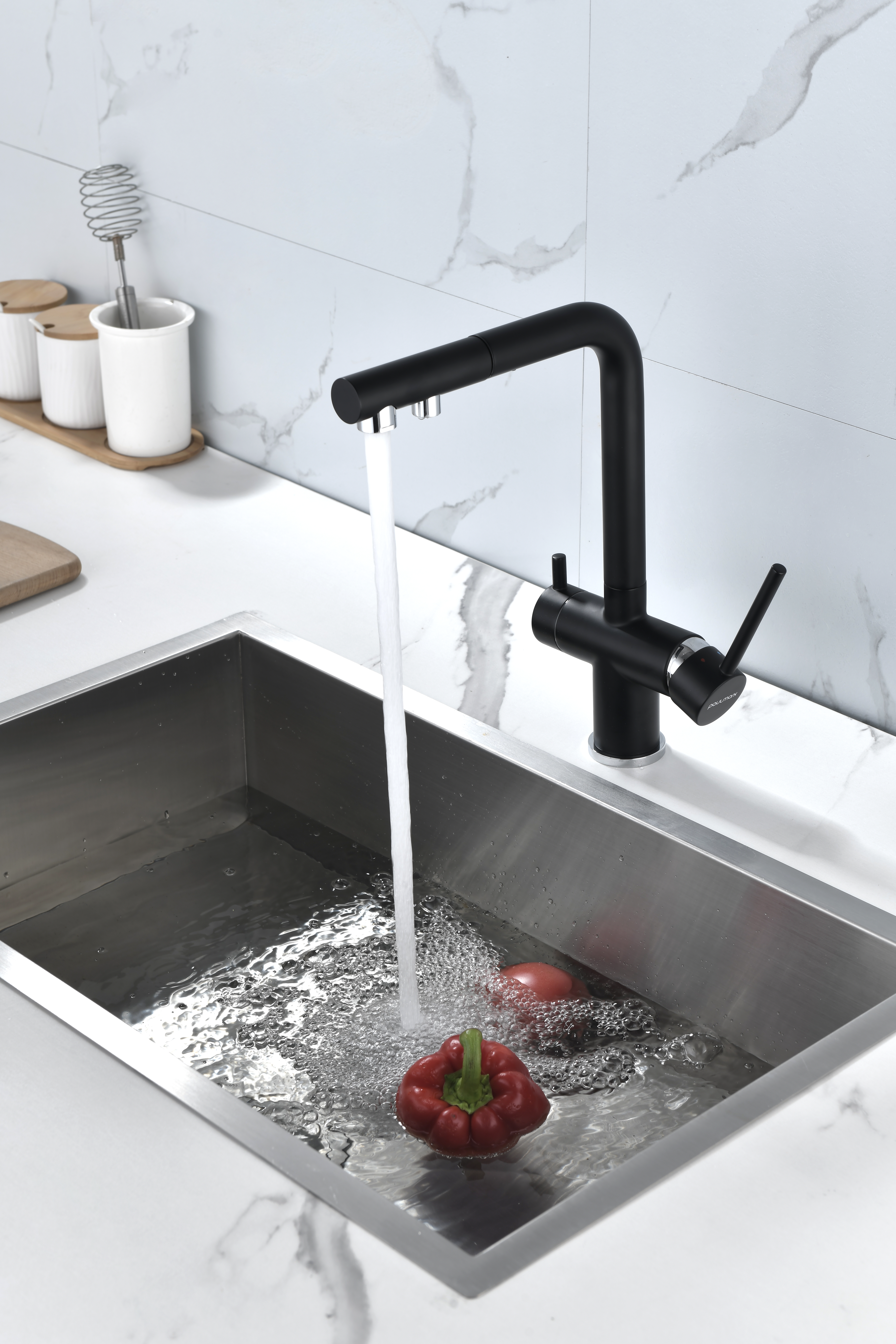 SERPENTINE оснащён функцией TRINKWASSER - излив смесителя имеет встроенный независимый канал для питьевой воды из фильтра, таким образом питьевая и водопроводная вода не смешиваются. Управление питьевой водой осуществляется отдельным рычагом, расположенным слева. Для пуска водопроводной воды используется большой рычаг справа.