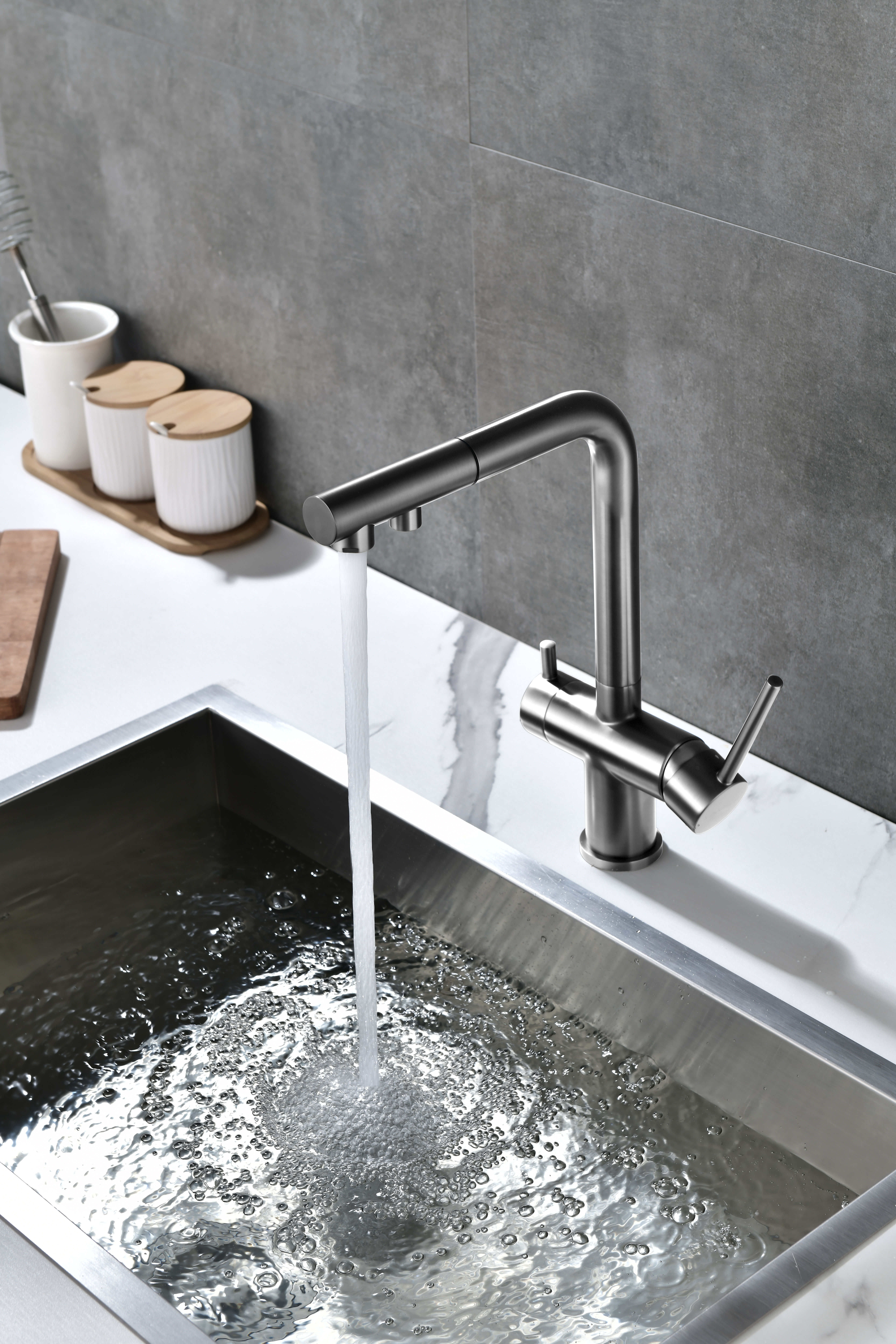 Смеситель оснащен гибким выдвижным изливом из нейлоновой оплетки, которая обладает отличной устойчивостью к истиранию и разрушению. Данная техническая особенность расширяет рабочую зону смесителя, позволяя пользоваться им с удобством в больших мойках, мойках с двумя чашами, или наполнять водой ёмкость на столе рядом с мойкой, в том числе питьевой водой.