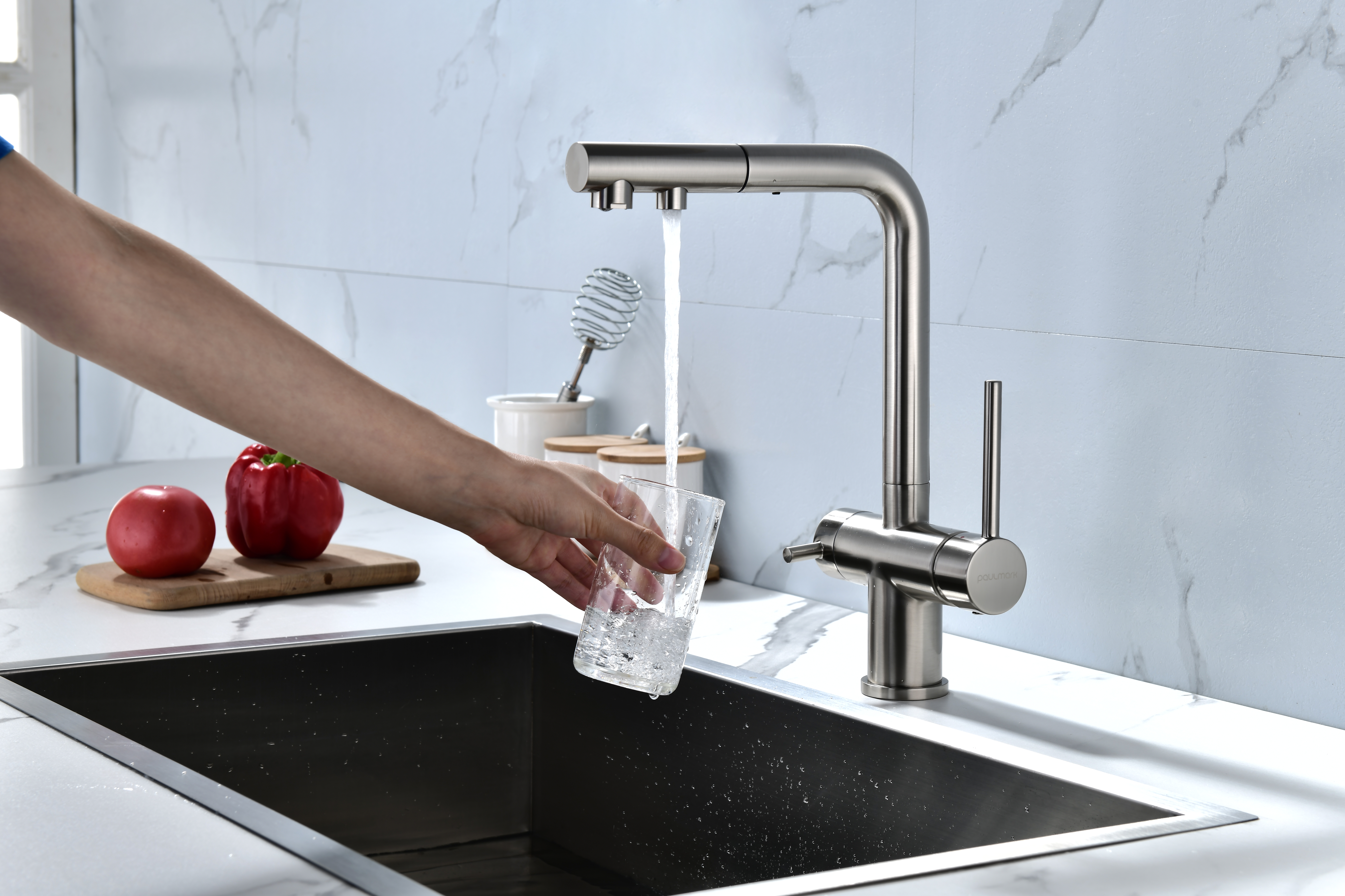 SERPENTINE оснащён функцией TRINKWASSER - излив смесителя имеет встроенный независимый канал для питьевой воды из фильтра, таким образом питьевая и водопроводная вода не смешиваются. Управление питьевой водой осуществляется отдельным рычагом, расположенным слева. Для пуска водопроводной воды используется большой рычаг справа.