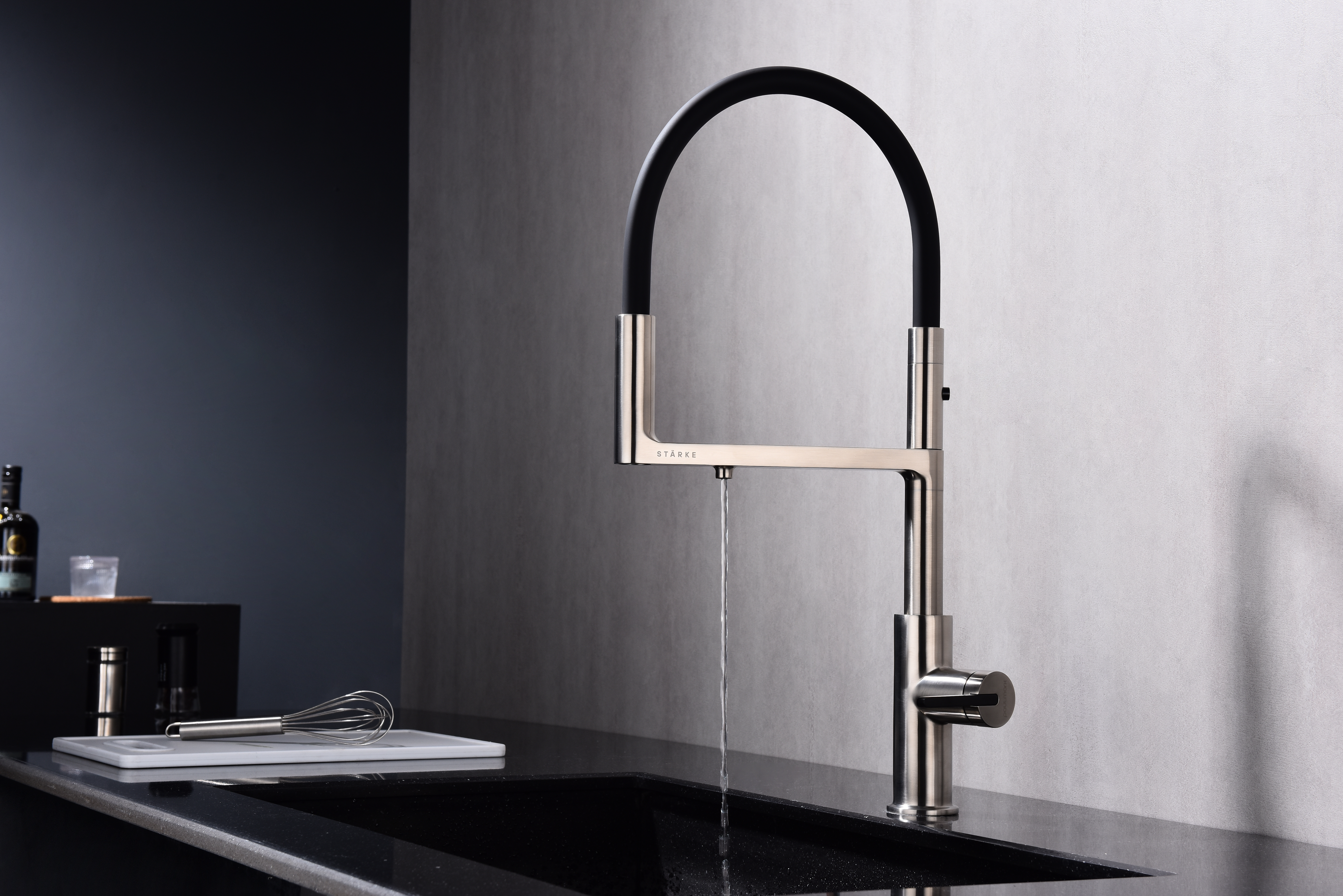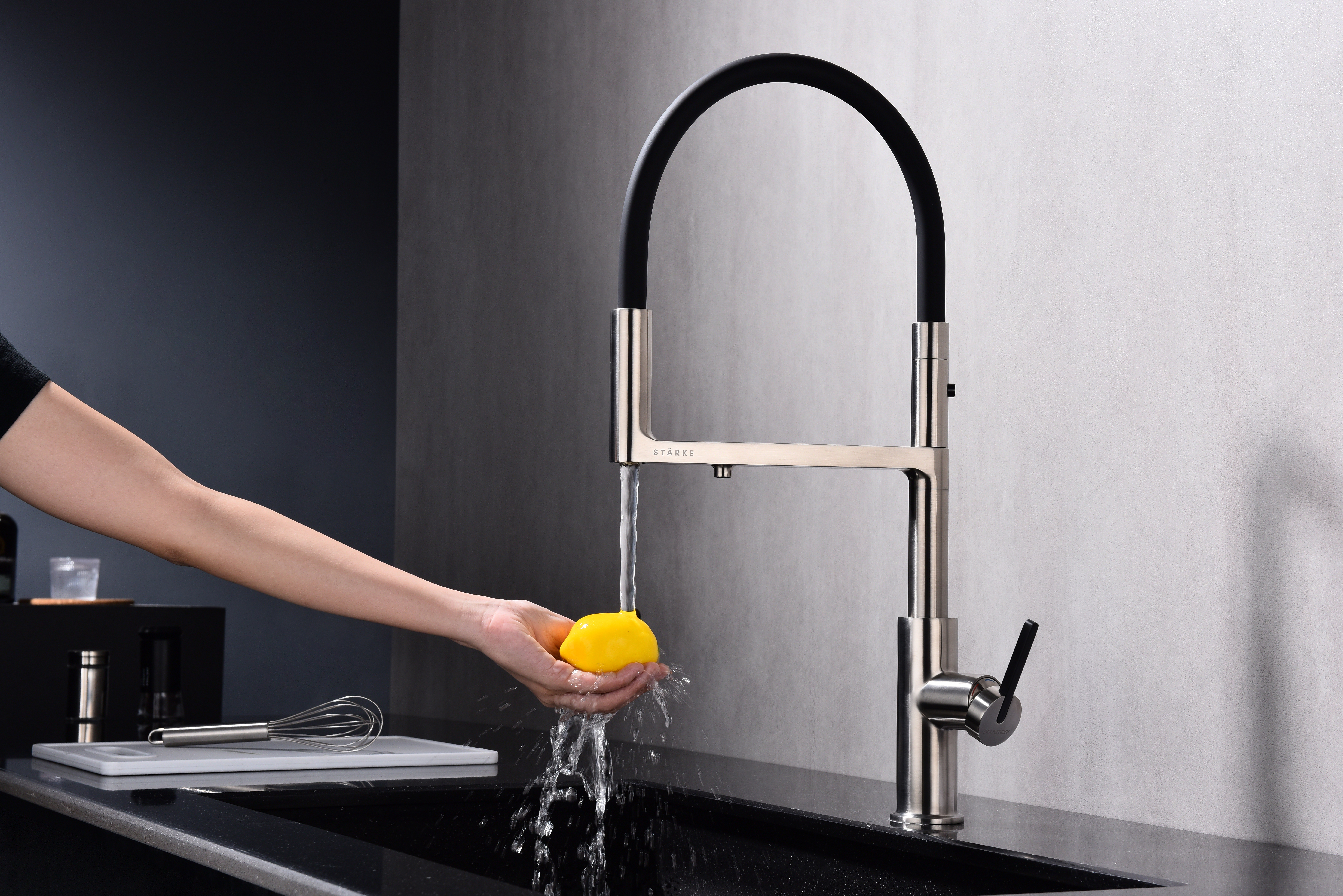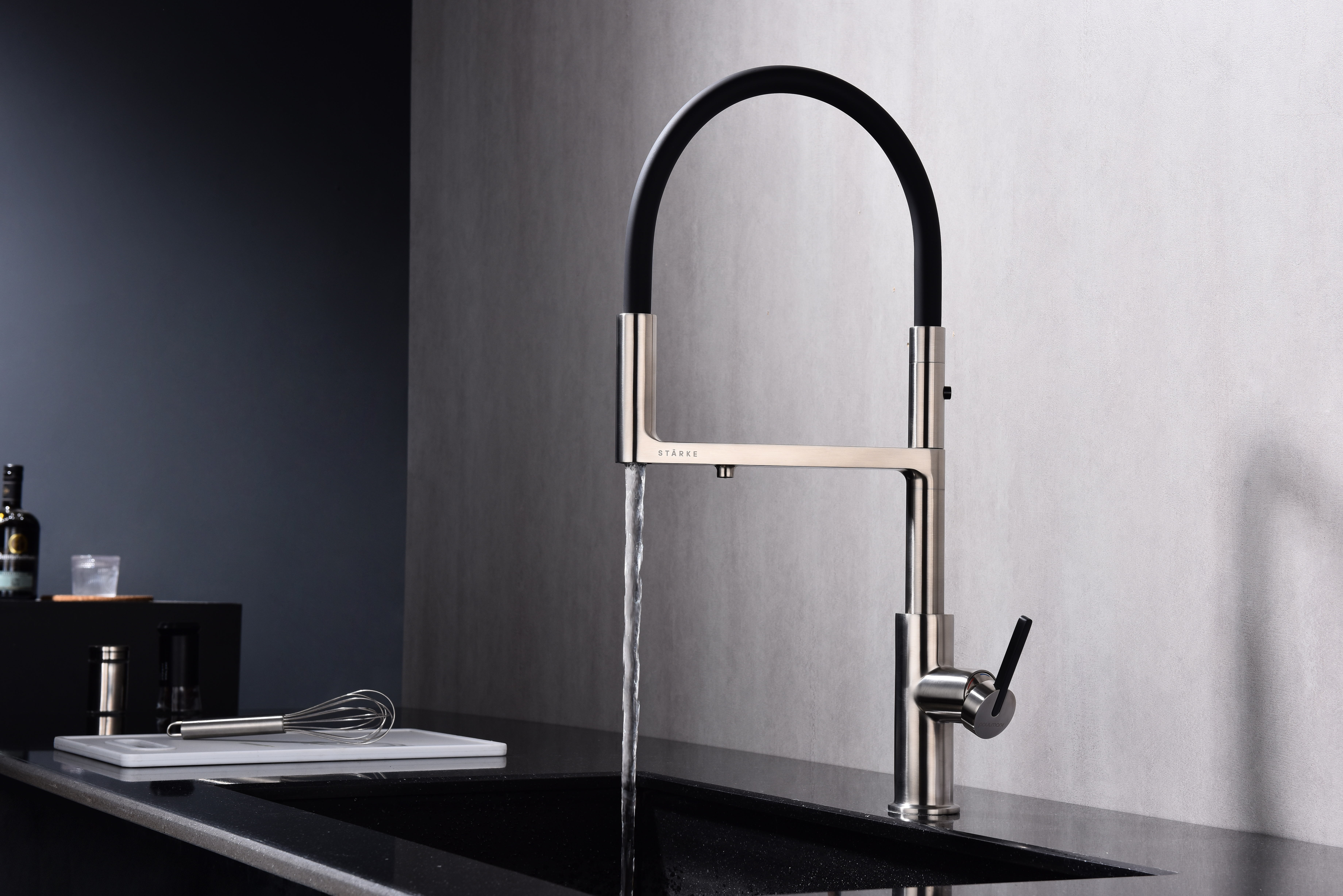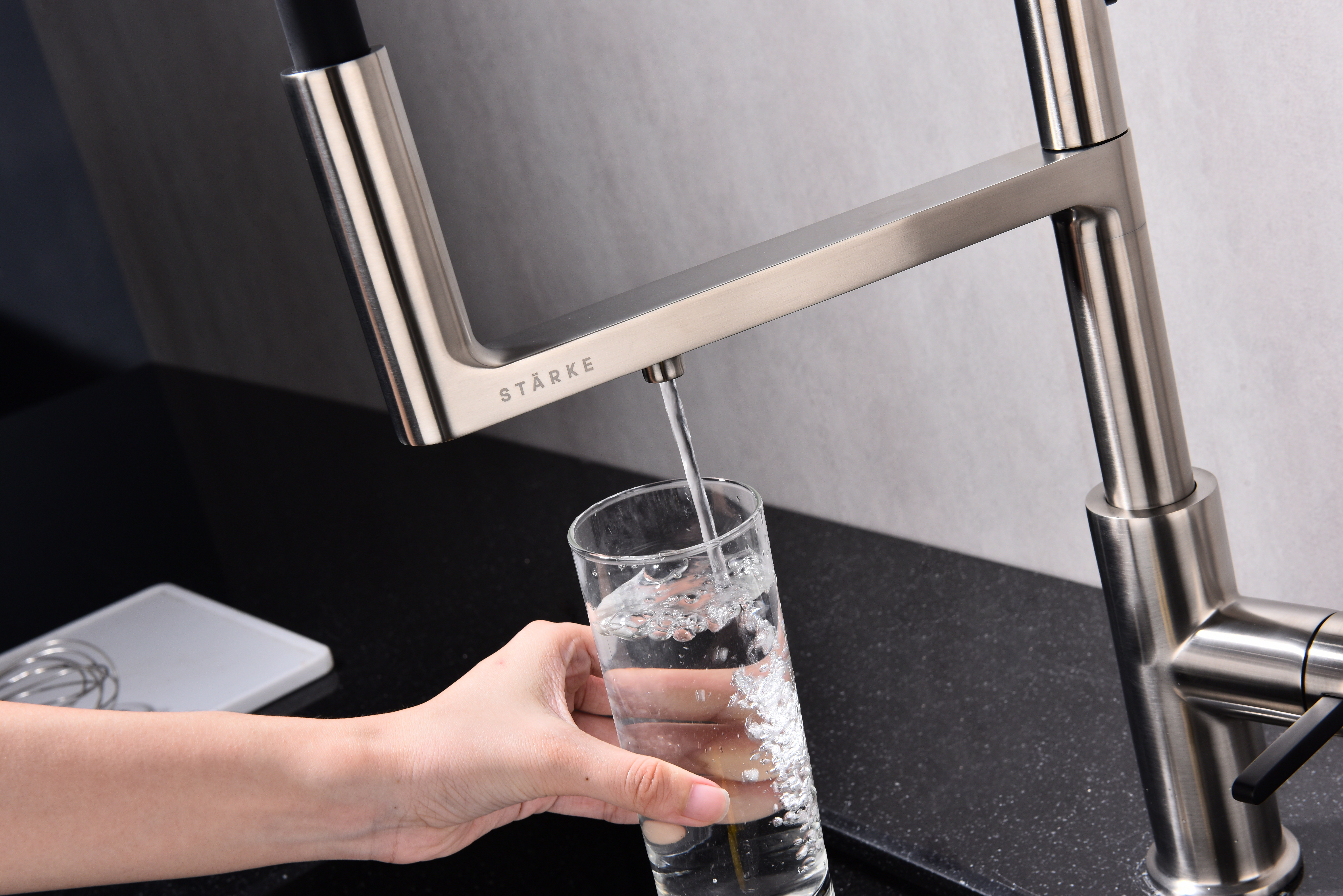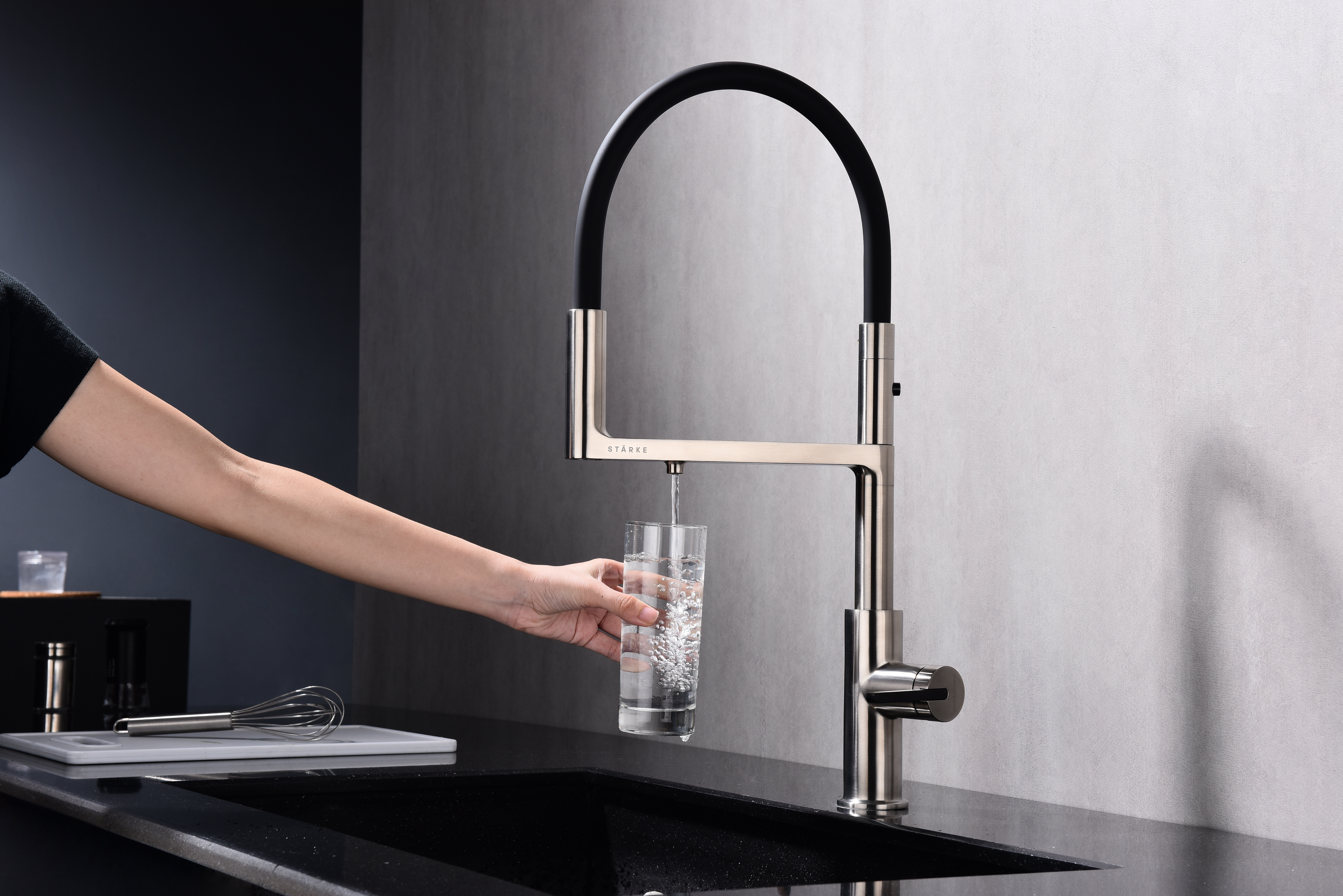 TORNADO оснащён функцией TRINKWASSER – в смесителе присутствует встроенный независимый канал для питьевой воды из фильтра, которая подается из отдельного аэратора на латунной части излива. Водопроводная вода подаётся из гибкого силиконового излива. Управление питьевой водой производится рычагом слева. Рычаг справа управляет подачей водопроводной воды. Совмещение подачи питьевой и водопроводной воды в одном смесителе избавляет от необходимости ставить дополнительный кран и позволяет сделать зону мойки максимально эстетичной.